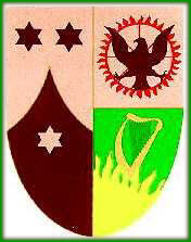 The lower part of the right hand portion, with Brian Boru’s harp, the official emblem of the Republic of Ireland, and a sunburst behind it vividly portrays the foundation of our province by the Province of Ireland after the period of persecution when the sunburst became the symbol of a resurrected freedom in Irish heraldry.